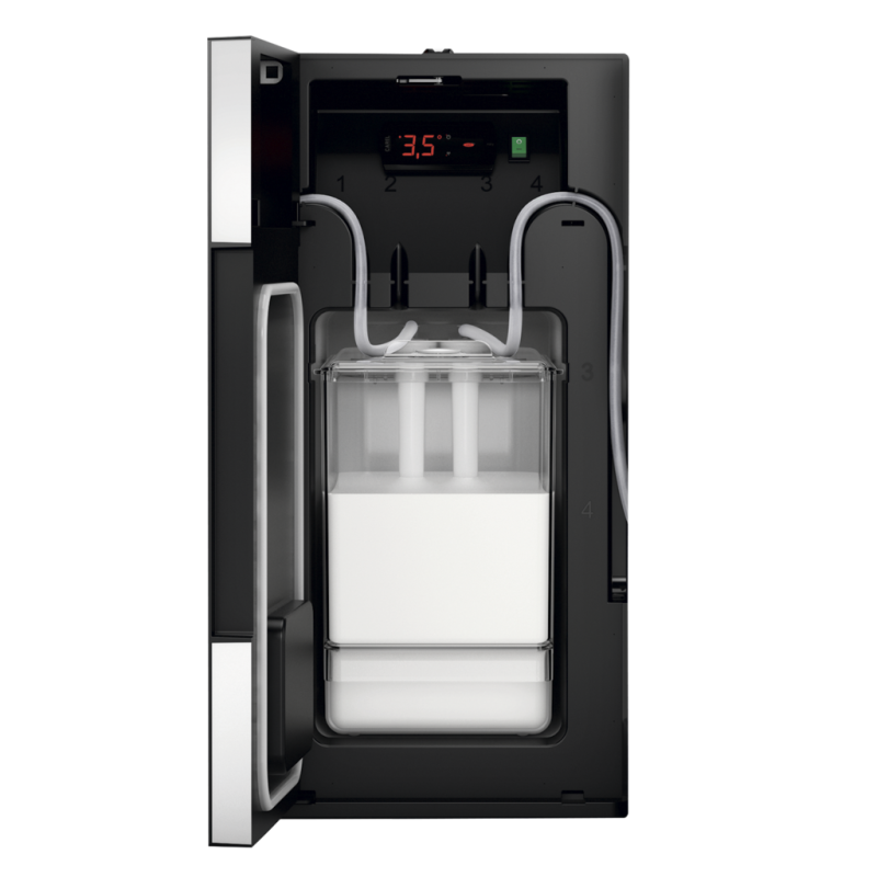 - Køleskabet er designet til at stå enten mellem to WMF-kaffemaskiner eller ved siden af én enkelt maskine, hvortil det er muligt at have to forskellige mælketyper. Den har en aftagelig mælkebeholder med en kapacitet på 10,5 liter. Mælken opbevares sikkert og hygiejnisk ved en konstant, afkølet temperatur. Køleskabet opretholder den perfekte temperatur, som sikre de optimale forhold for at opnå førsteklasses mælkeskum. Alt er let tilgængeligt, hvilket gør det nemt og effektivt at betjene flere kunder med lækre kaffespecialiteter. I selvbetjeningsområder giver løsningen også gæsterne mulighed for nemt og stilfuldt at servere sig selv. Køleskabet passer til WMF 1500 S+, WMF 5000 S+ og WMF 9000 S+.