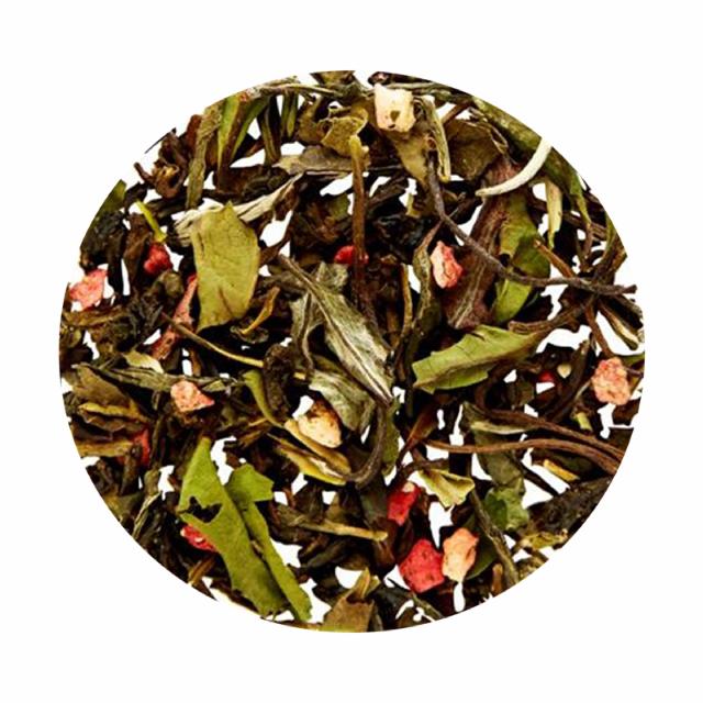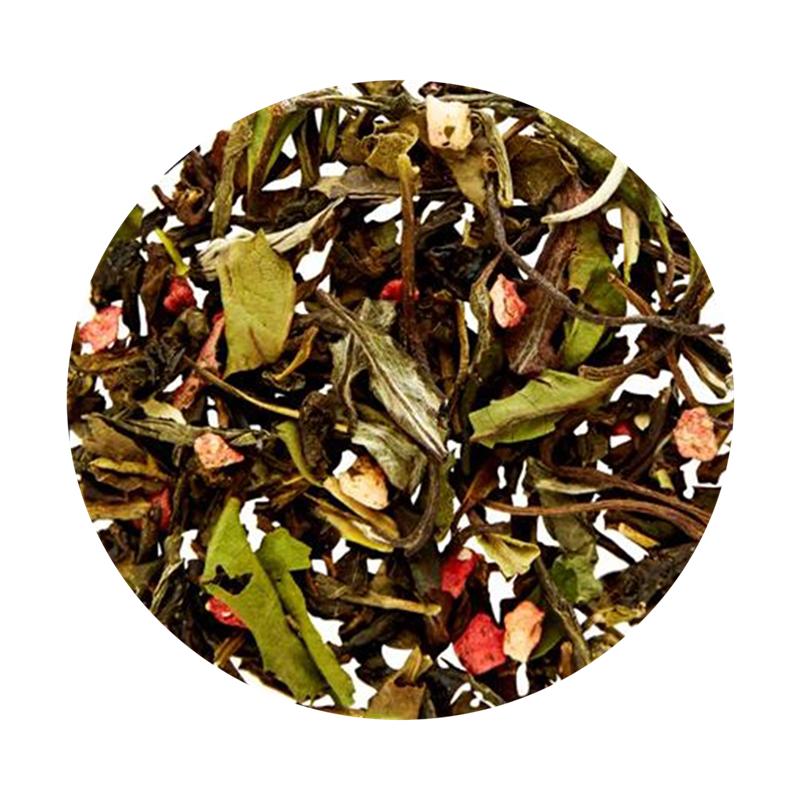 Grøn Ceylon te*(61%), hvid Ceylon te*(34%) og naturlig jordbær aroma, naturlig jasmin aroma og frysetørrede jordbær* *=økologisk